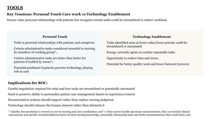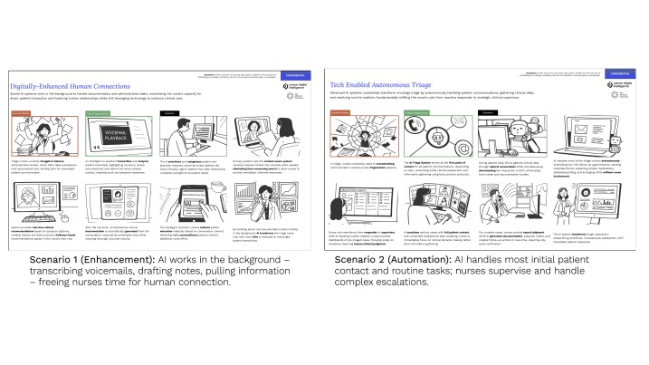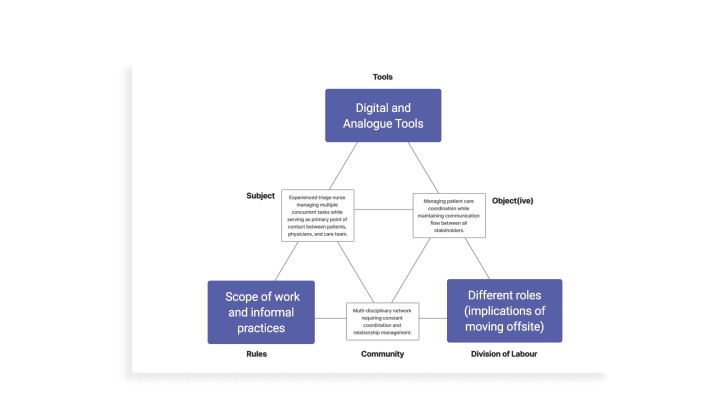 In order to understand how to AI could be adopted into nurse triage, the team spent two months embedded in situ, observing nurses across shifts and cancer types. In addition to the well understood components of triage such as calls, handoffs and coordination, the team documented components of care work that are often invisible such as how nurse experience shaped clinical judgment, the emotional labour of managing patients in crisis and the importance of informal peer support.