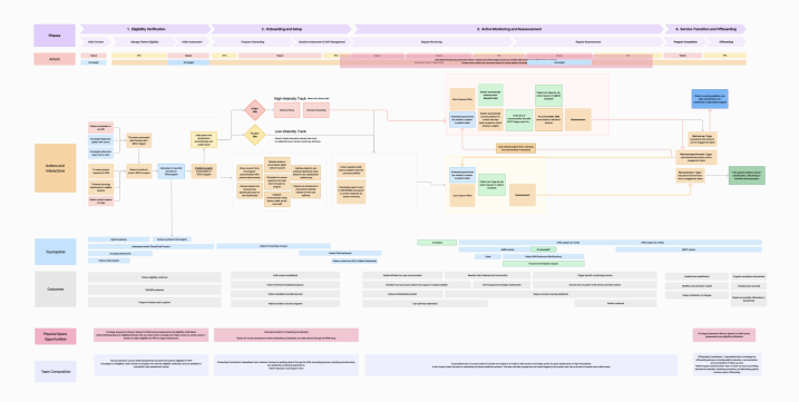 Analysis began with core service design tools. Service maps identified activities, handoffs and outcomes, clarifying how triage functioned across channels and roles. In parallel, interviews with the working group and nurses explored where AI augmentation might support existing practice. This dual lens – mapping current workflows while exploring augmentation opportunities – surfaced early possibilities for intervention.