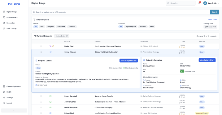 This project was a collaboration between members of Cancer Digital Intelligence, a design and technology team operating inside Princess Margaret Cancer Centre (PMCH) and applied researchers and graduate students from the University of Toronto. The exploration of AI triage formed part of a broader change initiative that involved redistributing labour among staff, redefining nursing roles, and adapting workspaces and tools. AI triage was introduced in a time when PMCH operated under high pressure and with overlapping and often conflicting priorities.