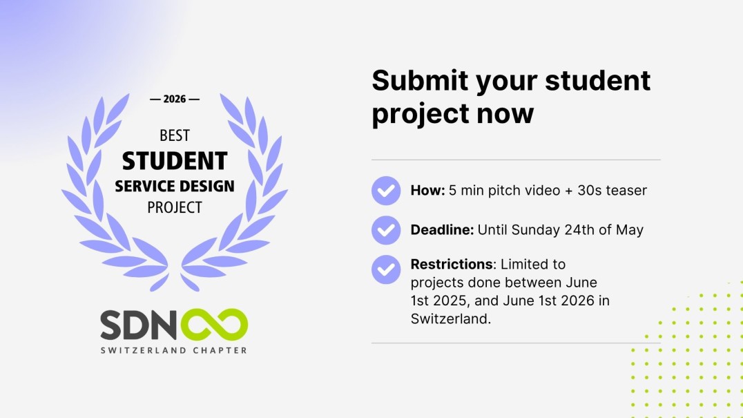 All projects will be displayed during the Swiss Service Design Day, on the Swiss Service Design Network website, and the winners will be announced during the event.